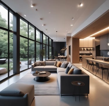 Rhythm in interior design refers to the repetition of elements to guide the eye smoothly through a space. This can be accomplished through patterns, colors, or textures. For example, repeating a certain shape in the cushions and lighting fixtures can create a visual rhythm that enhances the overall flow of the design.